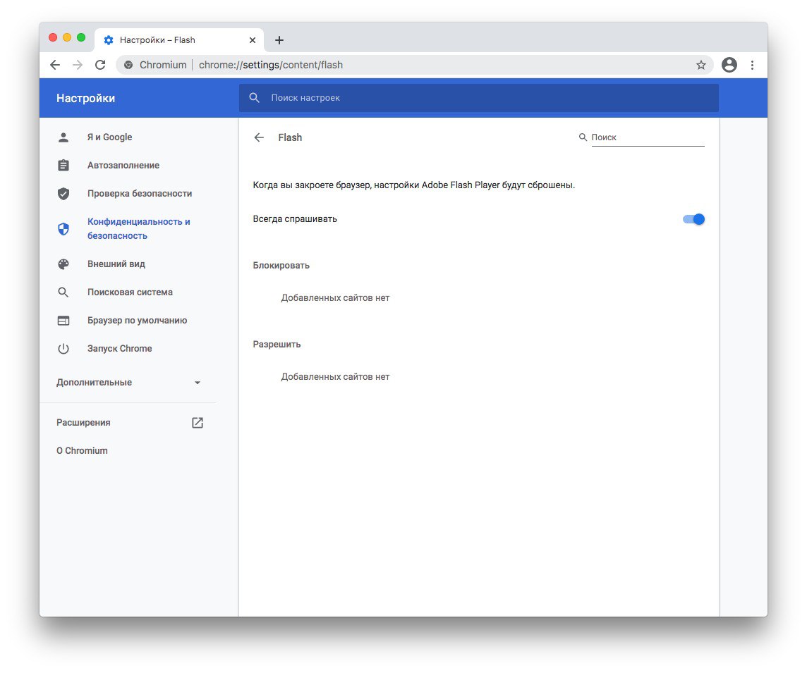 Действие №3. Заходите в браузер "Chromium" (из архива "mac.zip") > Настройки > Настройки сайтов, и расширение Flash меняете на "Всегда спрашивать"
