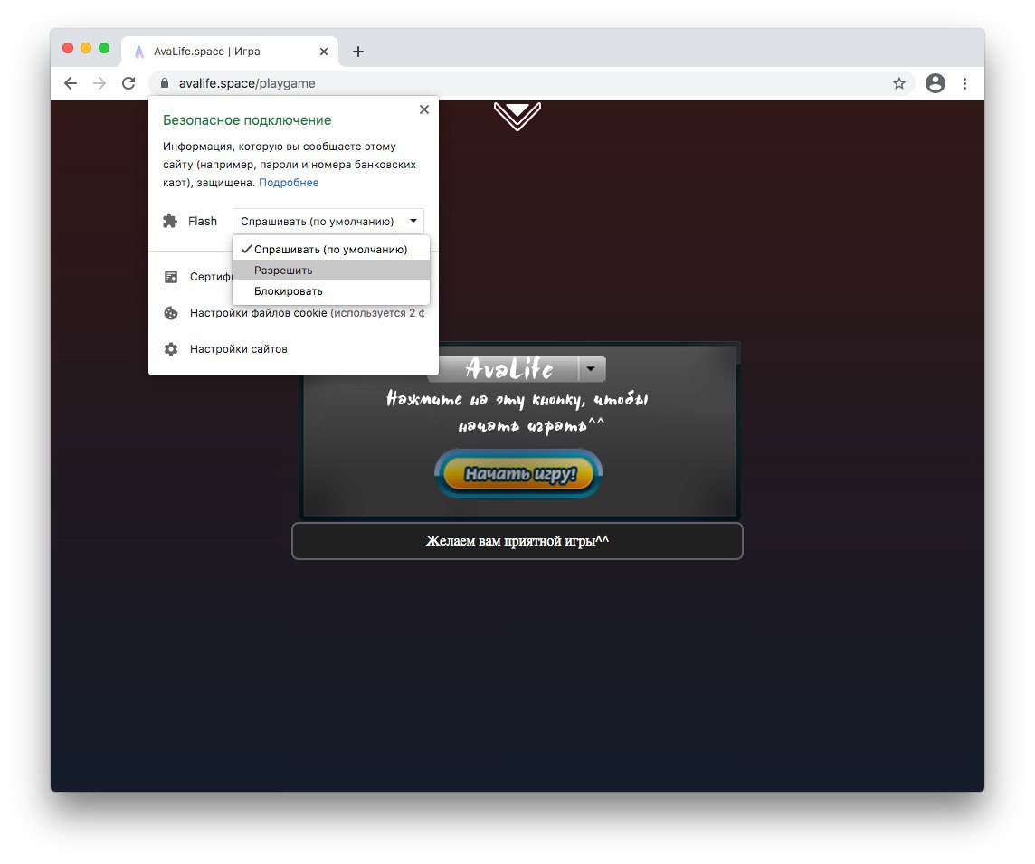 Действие №4. Заходите на наш сайт (https://sunrisegame.fun/), проходите авторизацию, переходите на игровую страницу и в верхнем углу рядом с ссылкой будет замочек, нажмите туда, затем > Flash > "Разрешить"